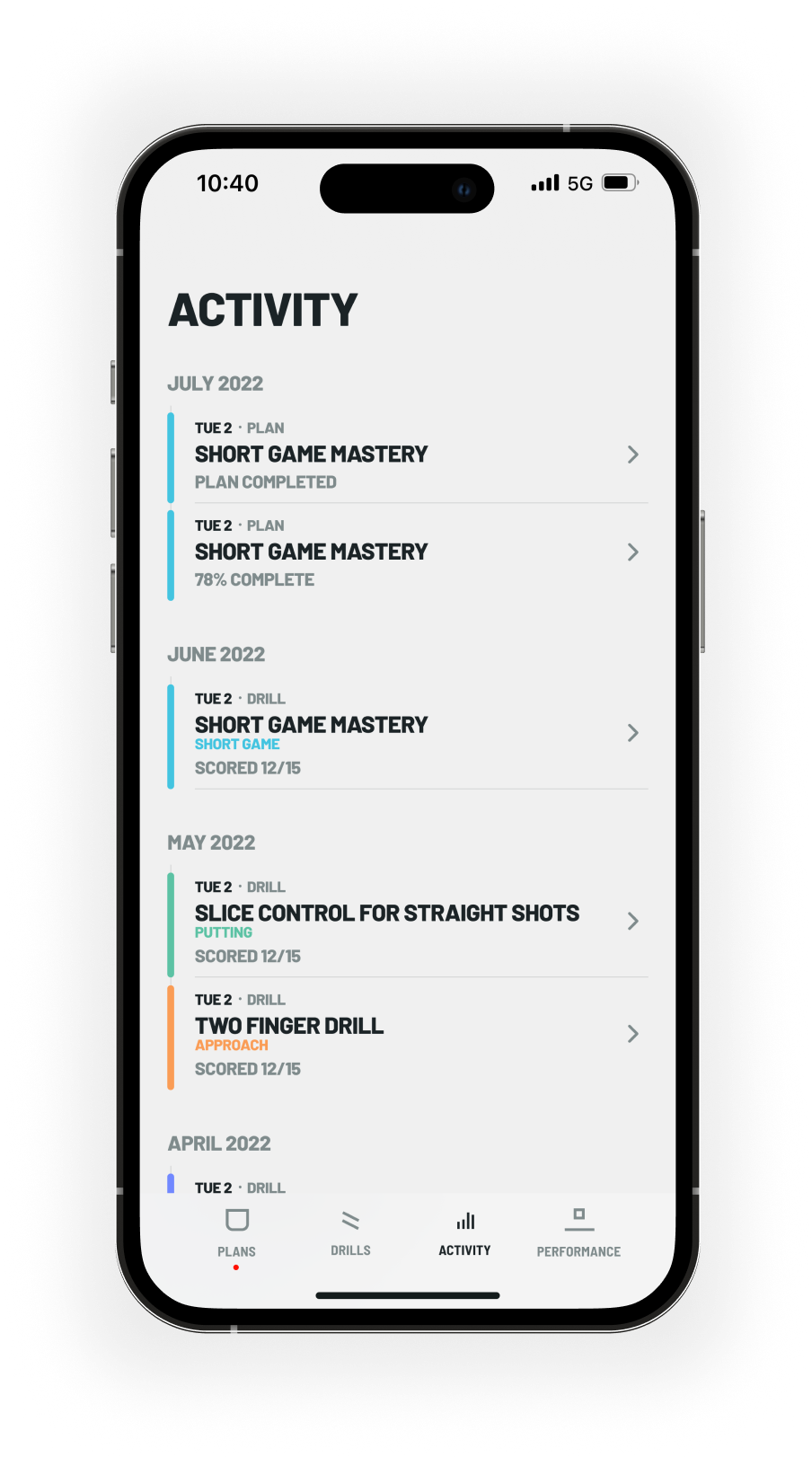 A handy record of your practice sessions so you can see how you performed in each drill.