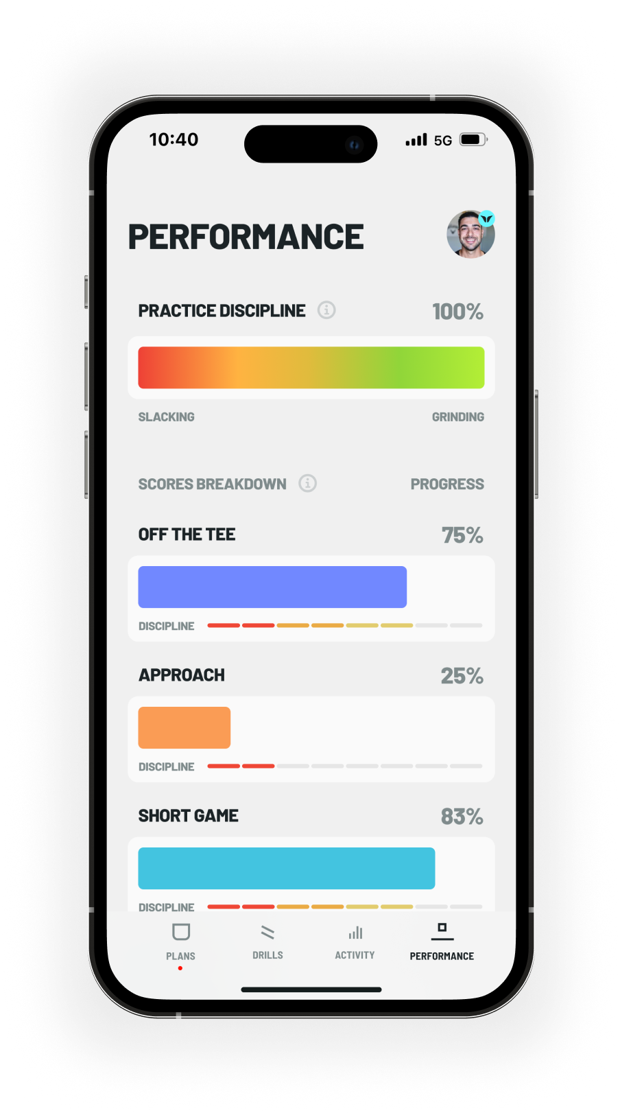 Get a complete overview of your performance in each game area, as well as a reminder of how disciplined you have been with your practice.
